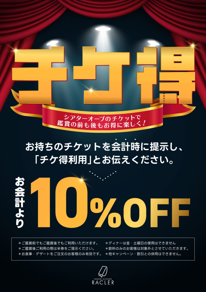 チーズキッチンRACLER(ラクレ)では、東急シアターオーブをご利用のお客様に向けたお得なサービス「サービスチケ得」を実施しております。